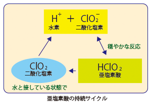 この亜塩素酸は細菌類や、真菌類に対して強い殺菌効果を持ち、さらに効果を持続させるサイクルがあります。