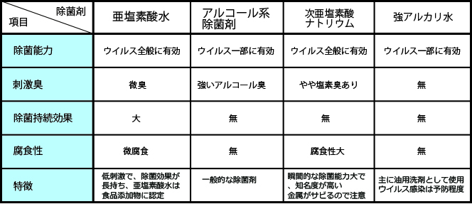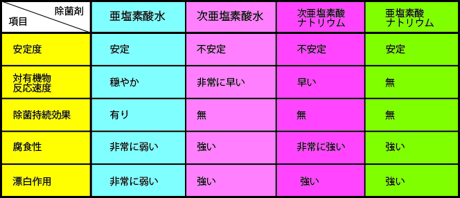 除菌剤の比較をしてみました。 まずは塩素系除菌剤の比較表です。 続いて様々な除菌製剤の比較です。